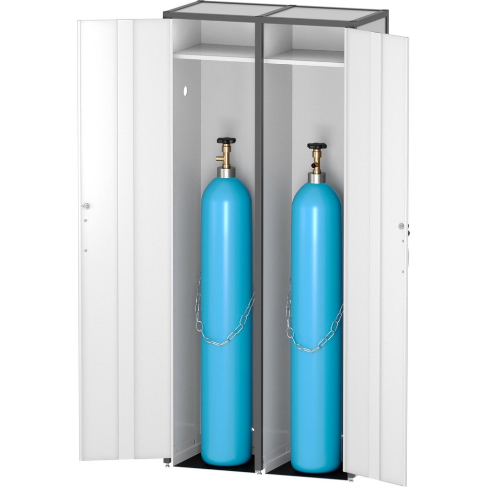 Шкаф шириной 800 мм, высотой 1825 мм из окрашенной стали для хранения двух баллонов вместимостью 40 литров.