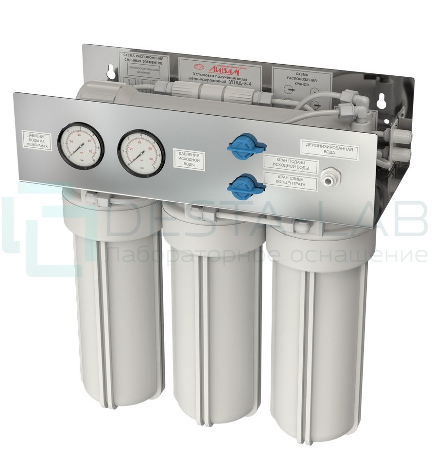 Преимуществом деионизатора воды УПВД 5-4 является полное отсутствие энергопотребления. Лабораторная обратноосмотическая установка для воды 2 типа УПВД не требует подключения к эл. сети. Очистка происходит за счёт использования предварительной фильтрации, обратноосмотических мембран и ионизирующей смолы. Деионизатор УПВД подходит для предприятий, научных центров и лабораторий, где требуется вода для лабораторного анализа 2 типа с электропроводностью не более 1,0 мкСм/см.