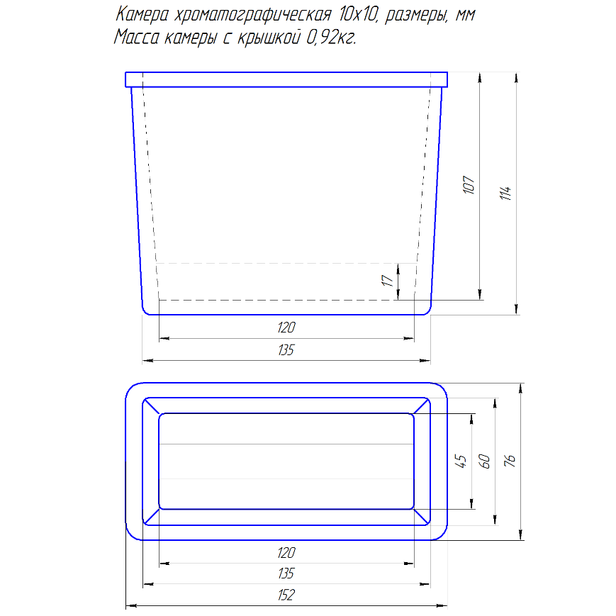 Камеры хроматографические изготовлены из химически стойкого стекла. Камеры 10х10 см и 15х15 см имеют специальный разделительный выступ на дне для надежной фиксации пластин и экономии используемого элюента и оснащены пришлифованной крышкой. Камера 20х20 см без выступа на дне.