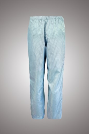 Защитная одежда для чистых помещений для работы в помещениях класса чистоты ISO 7 — ISO 8. Брюки многоразовые, изготовлены из полиэфирных тканей (96 % полиэстер, 4 % антистатическая нить; 52 % полиэстер, 45 % хлопок, 3 % углеродная нить; 65 % полиэстер, 35 % хлопок), подлежат стерилизации.