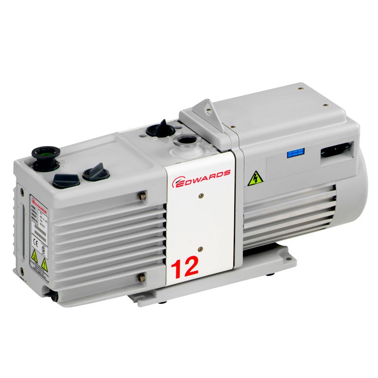 Edwards RV12 - двухступенчатый вакуумный пластинчато-роторный насос, в котором для уплотнения между элементами в рабочей камере используется вакуумное масло. Насос предназначен для откачки парогазовой смеси из вакуумных объёмов. Откачной механизм приводится в действие напрямую одно- или трёхфазным электродвигателем через гибкую муфту. Вторая ступень и маслянное уплотнение зазора позволяет значительно повысить компрессию и снизить эффект перетекания газа во внутренних зазорах рабочей камеры. Повышение компрессии приводит к снижению предельного остаточного давления в диапазоне 10-4 - 10-3 мбар.