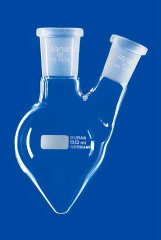 Колба двухгорлая грушевидная Lenz производится, как в соответствии с международным стандартом DIN 12383, так и в дополнение к нему. Колба двухгорлая грушевидная Lenz выполнена с двумя горловинами с коническими шлифами, боковой шлиф расположен под углом 25° к центральному. Колба двухгорлая грушевидная Lenz имеет поле для надписи, выполнена из высококачественного боросиликатного стекла марки DURAN.