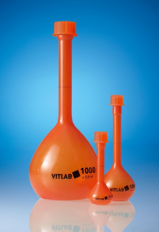 Мерная колба VITLAB с винтовой крышкой для хранения светочувствительных веществ. - Высокая прозрачность. - Поглощение ультрафиолетовых лучей. - Индивидуальная калибровка. - Погрешность измерения соответсвует приборам класса А согласно DIN EN ISO 1042.