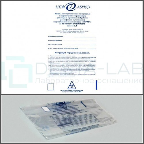 Пакеты (450х600 мм.) полипропиленовые одноразовые с индикаторами стерилизации, для сбора и термической обработки (дезинфекции и утилизации) медико-биологических отходов по ТУ 9398-014-27428909-2010